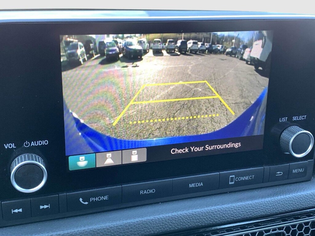 - The vehicle is equipped with a camera that displays an image of the area behind the vehicle on an interior display.
