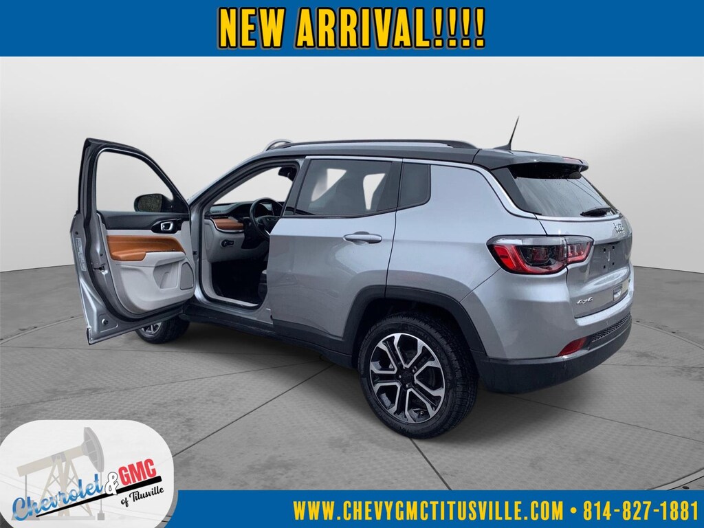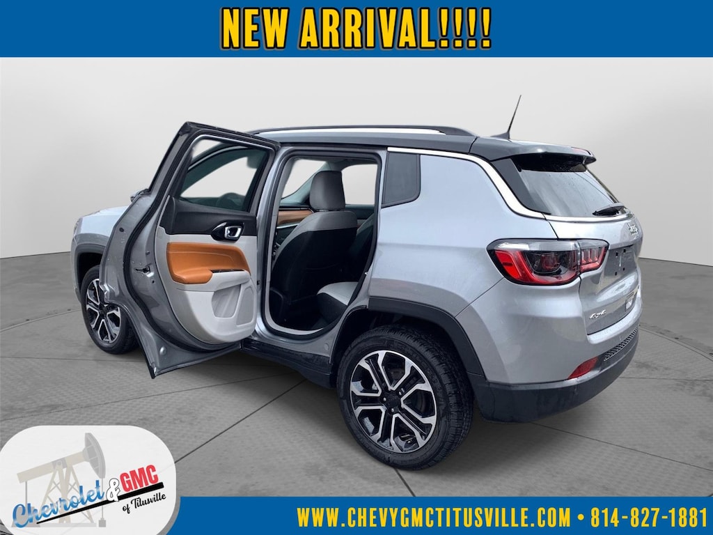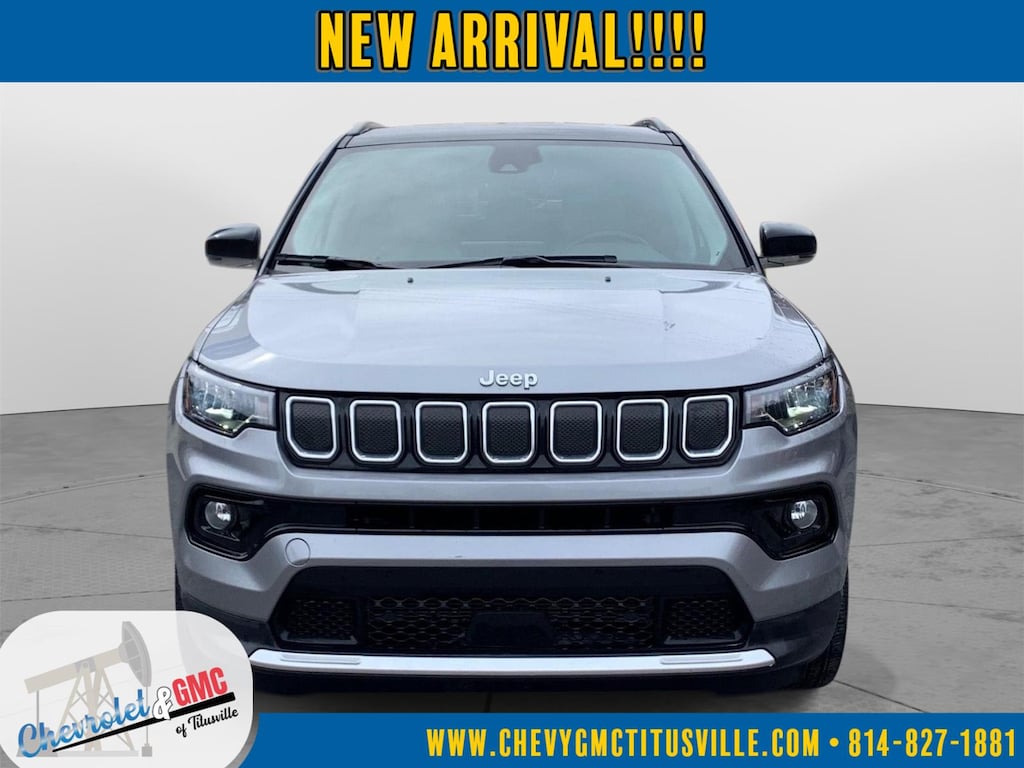 At Chevrolet and GMC of Titusville we believe that your car buying experience should be an enjoyable one. Its our goal to exceed your expectations in every way so that each and every time your family needs a car or truck, you know exactly where to go. We set out to accomplish that by staying firmly rooted in our values of integrity and professionalism in order to provide you with a truly superior customer service experience. A proud member of the Dean Auto Group, were sure youll find the quality new or used vehicle you want from the manufacturers you love! Find exactly what youre looking for at a price that makes you smile... This 2022 Jeep Compass Limited has a beautiful Billet Silver Metallic Clearcoat exterior with Steel Grey interior. This vehicle has 22,551 miles has been thoroughly inspected by our factory trained service technicians and has been fully reconditioned for immediate delivery. We're happy to provide this Compass's CARFAX vehicle history report upon request as well. Carfax No Accidents! Carfax One Owner! IMPORTANT PACKAGE INFORMATION Quick Order Package 2GG Comfort Heated steering wheel - A warm touch. Trying to drive with bulky winter gloves on isn't always easy. Keep your hands warm in cold temperatures so you can ditch the mitts and get a firm grip with this heated steering wheel.Convenience Smart device and keyfob engine start control - Phone ahead. Remotely start your vehicle's engine from the key fob or your smart device, ensuring your ride is ready to go when you get in. Now you can stay comfortable inside while your vehicle gets comfortable outside, ,thanks to Smart device and Keyfob engine start control. Keyfob engine start control - Get an early start. Remotely start your vehicle's engine from the key fob, ensuring your ride is ready to go when you get in. Now you can stay comfortable inside while your vehicle gets comfortable outside, thanks to Keyfob engine start control.Safety and Security Blind spot warning - Protect your blind side. You checked the mirror, looked over your shoulder and still nearly collided with the car next to you. Blind spot warning alerts you to the presence of a vehicle to your sides or rear so you know if you're about to make an unsafe lane change. Replace fear and uncertainty with confidence and safety with blind spot warning.Technology and Telematics Smart device mirroring - Smartphone, meet smart car. You can control your device through your vehicle's infotainment system. Smart device mirroring brings together safety and convenience by making it easier to find what you're looking for while keeping your eyes on the road. ENGINE: 2.4L I4 ZERO EVAP M-AIR W/ESS, TRANSMISSION: 9-SPEED 948TE AUTOMATIC, QUICK ORDER PACKAGE 2GG, WHEELS: 18" X 7" PAINTED DIAMOND CUT ALUMINUM, TIRES: 225/55R18 BSW AS, TU-TONE PAINT GROUP, BILLET SILVER METALLIC CLEARCOAT, BLACK CLEARCOAT, STEEL GREY, LEATHER TRIMMED BUCKET SEATS, FRONT LICENSE PLATE BRACKET We value-price our vehicles to assure our customers get an easy & notable car buying experience. With every New & Pre-Owned purchase you become part of our Chevrolet and GMC of Titusville family, and being a family member has benefits: 1. Complimentary PA State Inspections for the Life of the Vehicle (dealer covers inspection fee, customer responsible for applicable sticker fees) 2. Lifetime Powertrain Warranty (some exclusions apply) 3. Complimentary 21-point inspection and safety check for the life of the vehicle with ANY service appointment *Valid for vehicles purchased after 1/1/2025. **Offers not redeemable for cash. Due to heavily discounted market based pricing, vehicles are selling more quickly than our website updates. To verify availability on this vehicle please contact our client care team at 814-826-3375. Let us show you the difference in how we do things!