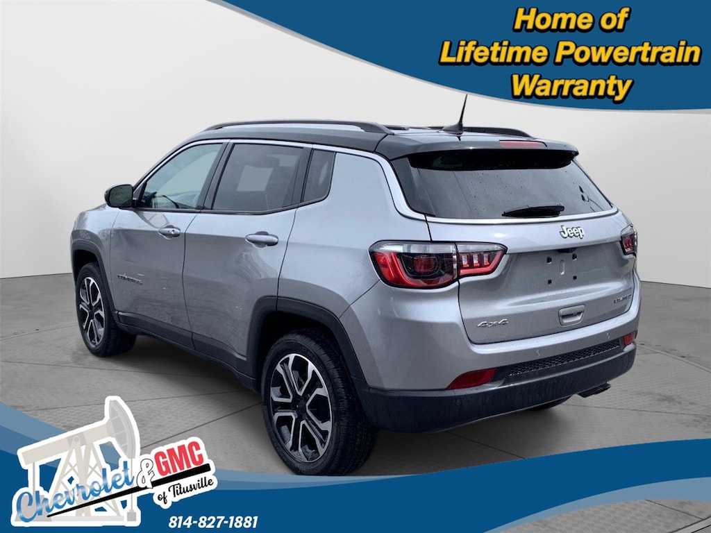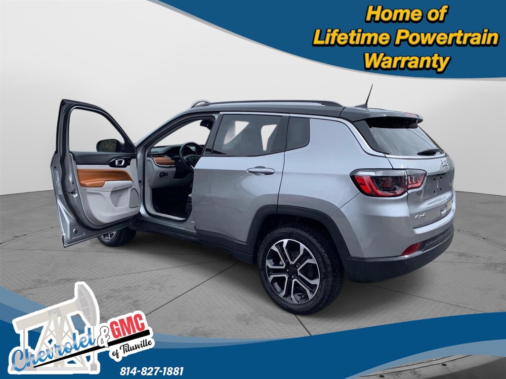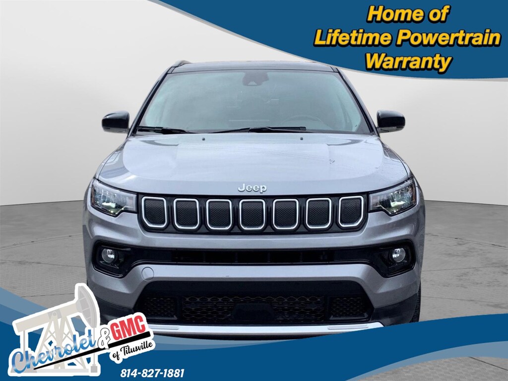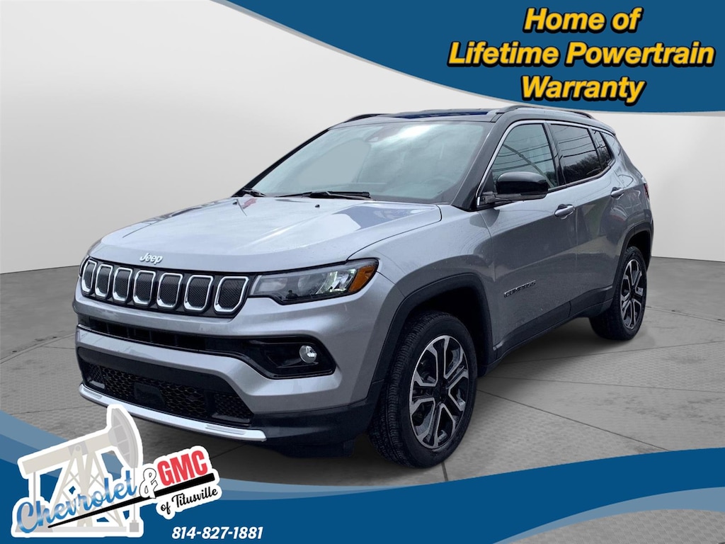 At Chevrolet and GMC of Titusville we believe that your car buying experience should be an enjoyable one. Its our goal to exceed your expectations in every way so that each and every time your family needs a car or truck, you know exactly where to go. We set out to accomplish that by staying firmly rooted in our values of integrity and professionalism in order to provide you with a truly superior customer service experience. A proud member of the Dean Auto Group, were sure youll find the quality new or used vehicle you want from the manufacturers you love! Find exactly what youre looking for at a price that makes you smile... This 2022 Jeep Compass Limited has a beautiful Billet Silver Metallic Clearcoat exterior with Steel Grey interior. This vehicle has 22,551 miles has been thoroughly inspected by our factory trained service technicians and has been fully reconditioned for immediate delivery. We're happy to provide this Compass's CARFAX vehicle history report upon request as well. Carfax No Accidents! Carfax One Owner! IMPORTANT PACKAGE INFORMATION Quick Order Package 2GG Comfort Heated steering wheel - A warm touch. Trying to drive with bulky winter gloves on isn't always easy. Keep your hands warm in cold temperatures so you can ditch the mitts and get a firm grip with this heated steering wheel.Convenience Smart device and keyfob engine start control - Phone ahead. Remotely start your vehicle's engine from the key fob or your smart device, ensuring your ride is ready to go when you get in. Now you can stay comfortable inside while your vehicle gets comfortable outside, ,thanks to Smart device and Keyfob engine start control. Keyfob engine start control - Get an early start. Remotely start your vehicle's engine from the key fob, ensuring your ride is ready to go when you get in. Now you can stay comfortable inside while your vehicle gets comfortable outside, thanks to Keyfob engine start control.Safety and Security Blind spot warning - Protect your blind side. You checked the mirror, looked over your shoulder and still nearly collided with the car next to you. Blind spot warning alerts you to the presence of a vehicle to your sides or rear so you know if you're about to make an unsafe lane change. Replace fear and uncertainty with confidence and safety with blind spot warning.Technology and Telematics Smart device mirroring - Smartphone, meet smart car. You can control your device through your vehicle's infotainment system. Smart device mirroring brings together safety and convenience by making it easier to find what you're looking for while keeping your eyes on the road. ENGINE: 2.4L I4 ZERO EVAP M-AIR W/ESS, TRANSMISSION: 9-SPEED 948TE AUTOMATIC, QUICK ORDER PACKAGE 2GG, WHEELS: 18" X 7" PAINTED DIAMOND CUT ALUMINUM, TIRES: 225/55R18 BSW AS, TU-TONE PAINT GROUP, BILLET SILVER METALLIC CLEARCOAT, BLACK CLEARCOAT, STEEL GREY, LEATHER TRIMMED BUCKET SEATS, FRONT LICENSE PLATE BRACKET We value-price our vehicles to assure our customers get an easy & notable car buying experience. With every New & Pre-Owned purchase you become part of our Chevrolet and GMC of Titusville family, and being a family member has benefits: 1. Complimentary PA State Inspections for the Life of the Vehicle (dealer covers inspection fee, customer responsible for applicable sticker fees) 2. Lifetime Powertrain Warranty (some exclusions apply) 3. Complimentary 21-point inspection and safety check for the life of the vehicle with ANY service appointment *Valid for vehicles purchased after 1/1/2025. **Offers not redeemable for cash. Due to heavily discounted market based pricing, vehicles are selling more quickly than our website updates. To verify availability on this vehicle please contact our client care team at 814-826-3375. Let us show you the difference in how we do things!