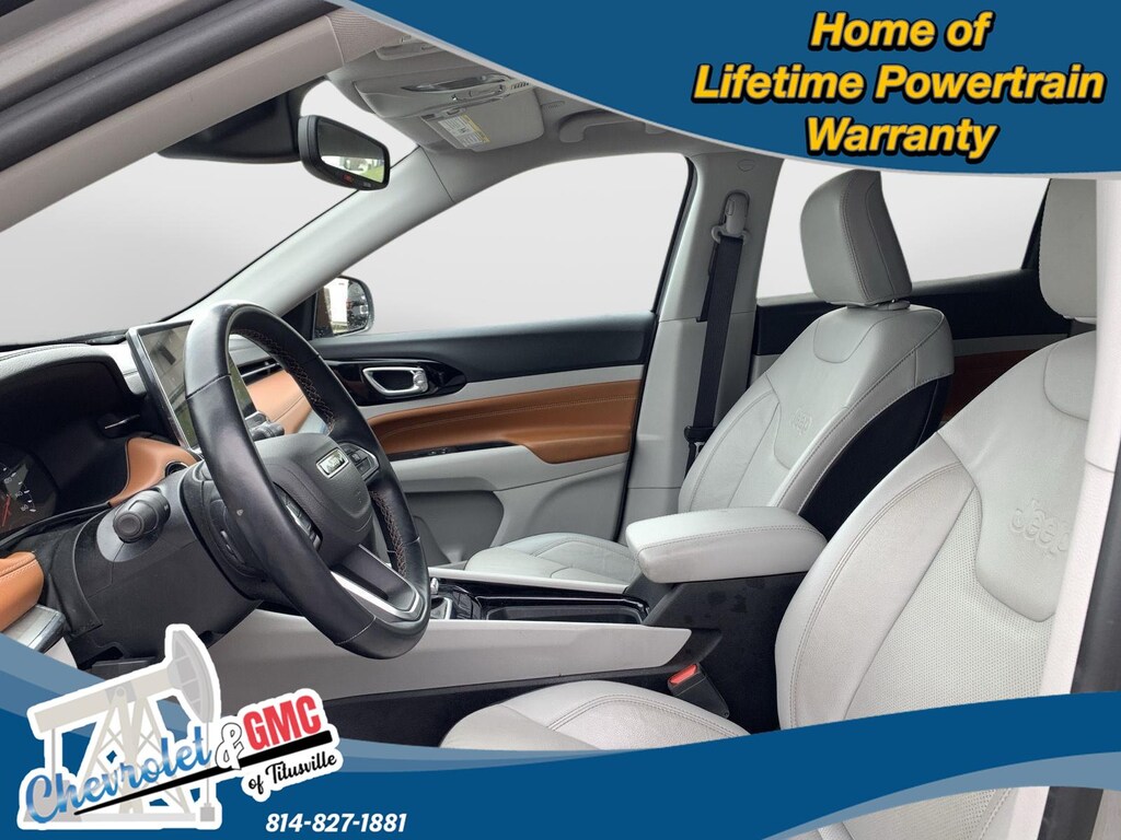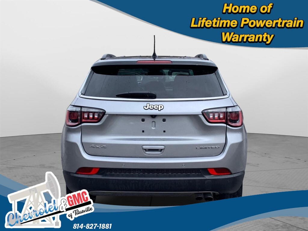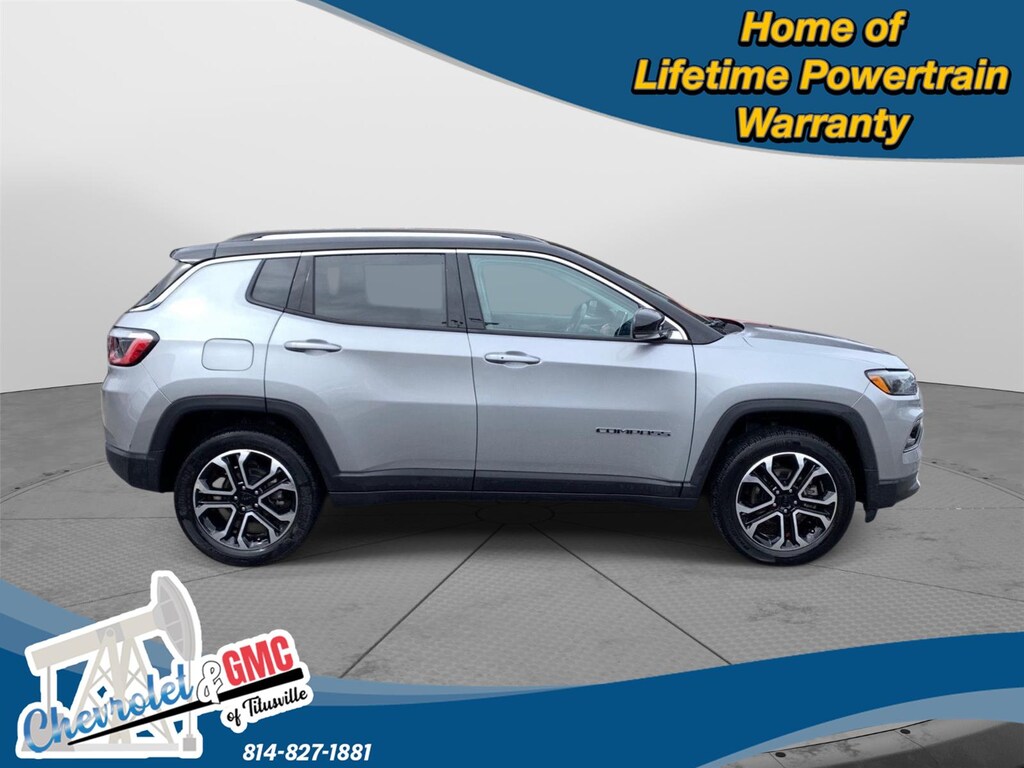 At Chevrolet and GMC of Titusville we believe that your car buying experience should be an enjoyable one. Its our goal to exceed your expectations in every way so that each and every time your family needs a car or truck, you know exactly where to go. We set out to accomplish that by staying firmly rooted in our values of integrity and professionalism in order to provide you with a truly superior customer service experience. A proud member of the Dean Auto Group, were sure youll find the quality new or used vehicle you want from the manufacturers you love! Find exactly what youre looking for at a price that makes you smile... This 2022 Jeep Compass Limited has a beautiful Billet Silver Metallic Clearcoat exterior with Steel Grey interior. This vehicle has 22,551 miles has been thoroughly inspected by our factory trained service technicians and has been fully reconditioned for immediate delivery. We're happy to provide this Compass's CARFAX vehicle history report upon request as well. Carfax No Accidents! Carfax One Owner! IMPORTANT PACKAGE INFORMATION Quick Order Package 2GG Comfort Heated steering wheel - A warm touch. Trying to drive with bulky winter gloves on isn't always easy. Keep your hands warm in cold temperatures so you can ditch the mitts and get a firm grip with this heated steering wheel.Convenience Smart device and keyfob engine start control - Phone ahead. Remotely start your vehicle's engine from the key fob or your smart device, ensuring your ride is ready to go when you get in. Now you can stay comfortable inside while your vehicle gets comfortable outside, ,thanks to Smart device and Keyfob engine start control. Keyfob engine start control - Get an early start. Remotely start your vehicle's engine from the key fob, ensuring your ride is ready to go when you get in. Now you can stay comfortable inside while your vehicle gets comfortable outside, thanks to Keyfob engine start control.Safety and Security Blind spot warning - Protect your blind side. You checked the mirror, looked over your shoulder and still nearly collided with the car next to you. Blind spot warning alerts you to the presence of a vehicle to your sides or rear so you know if you're about to make an unsafe lane change. Replace fear and uncertainty with confidence and safety with blind spot warning.Technology and Telematics Smart device mirroring - Smartphone, meet smart car. You can control your device through your vehicle's infotainment system. Smart device mirroring brings together safety and convenience by making it easier to find what you're looking for while keeping your eyes on the road. ENGINE: 2.4L I4 ZERO EVAP M-AIR W/ESS, TRANSMISSION: 9-SPEED 948TE AUTOMATIC, QUICK ORDER PACKAGE 2GG, WHEELS: 18" X 7" PAINTED DIAMOND CUT ALUMINUM, TIRES: 225/55R18 BSW AS, TU-TONE PAINT GROUP, BILLET SILVER METALLIC CLEARCOAT, BLACK CLEARCOAT, STEEL GREY, LEATHER TRIMMED BUCKET SEATS, FRONT LICENSE PLATE BRACKET We value-price our vehicles to assure our customers get an easy & notable car buying experience. With every New & Pre-Owned purchase you become part of our Chevrolet and GMC of Titusville family, and being a family member has benefits: 1. Complimentary PA State Inspections for the Life of the Vehicle (dealer covers inspection fee, customer responsible for applicable sticker fees) 2. Lifetime Powertrain Warranty (some exclusions apply) 3. Complimentary 21-point inspection and safety check for the life of the vehicle with ANY service appointment *Valid for vehicles purchased after 1/1/2025. **Offers not redeemable for cash. Due to heavily discounted market based pricing, vehicles are selling more quickly than our website updates. To verify availability on this vehicle please contact our client care team at 814-826-3375. Let us show you the difference in how we do things!